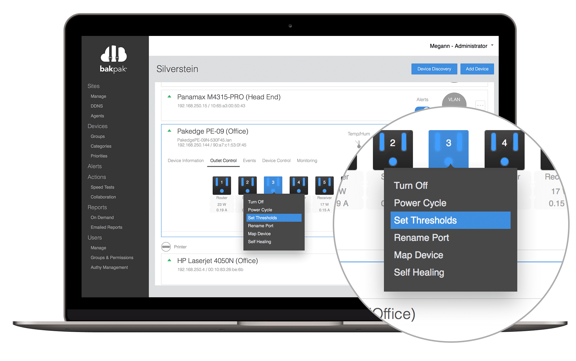 Set power thresholds for each port on PowerPak PDUs and supported third-party power products, including Middle Atlantic and Panamax. With PDU integration, receive real-time alerts for voltage, current thresholds, and device status, so you can proactively respond and troubleshoot any issue before a client is even aware of the problem. Ports can also be assigned daily schedules for energy savings or to power cycle a sensitive device in the middle of the night.